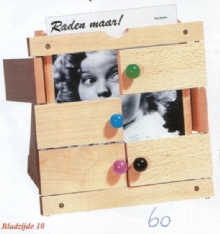 Raden maar is een raadspel want kent u ze nog die personen die langzaam te voorschijn komen? Men gooit met de kleurendobbelsteen en opent het vakje met de overeenkomstige kleur. Heeft men geraden wie er achter de deurtjes zit dan wordt de kaart weer achterin gestoken. Maar voorzichtig want is het antwoord fout dan gaat de kaart ook achterin. Er zijn vele speelwijzen mogelijk, individueel of in groepsverband met een competitie-element. Dit spel traint het geheugen, haalt herinneringen op en geeft voldoende gespreksstof. Inhoud: 30 foto’s van bekende personen, 20 pionnen, 1 kleurendobbelsteen en een gebruiksaanwijzing, afmeting kastje: 20 x 20 x 11 cm.